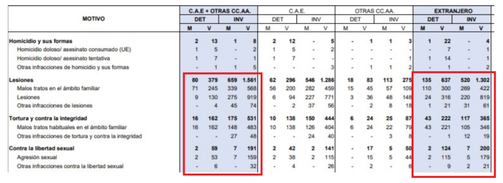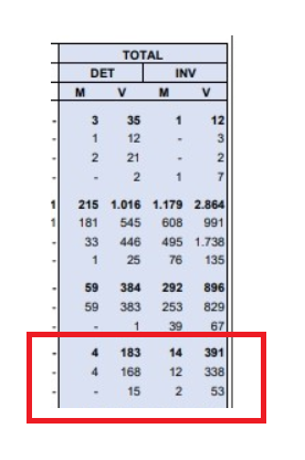 - INV: Investigados (o imputados/no detenidos). Personas que han sido identificadas e investigadas por la policía o guardia civil, pero no necesariamente detenidas en ese momento (por ejemplo, citadas, investigadas en diligencias previas, etc.).